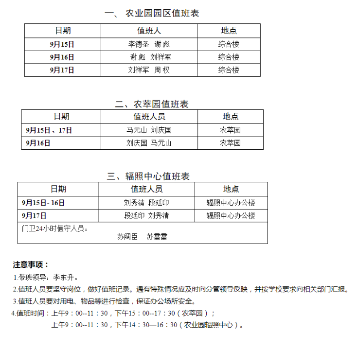 农业园办公室中秋值班安排